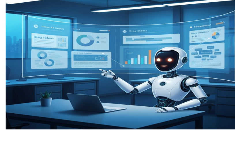 “An illustration of a futuristic workspace with an AI assistant brainstorming blog ideas on a large screen, surrounded by digital charts and keyword clouds, with a vibrant and innovative aesthetic.”